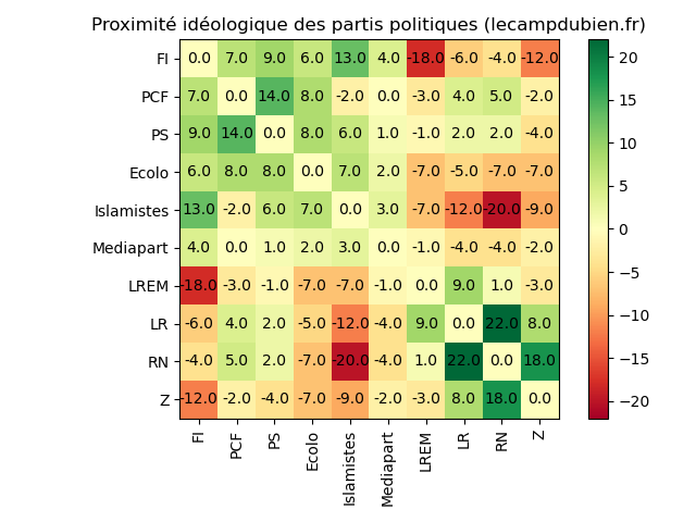 MéthodeCette page tente de mesurer numériquement la proximité idéologique entre partis politiques et d'autres acteurs influents. Il s'agit bien évidemment d'une estimation à titre indicatif.Pour deux partis X et Y, on compte le nombre de fois où X et Y sont d'accords parmi 116 sujets de société (voir tableau ci-dessous). Pour chaque évènement, on colorie en vert quand X est favorable/en accord/prend la défense, en rouge quand il est en désaccord. Quand plusieurs acteurs d'un même camp X se prononcent, on tient compte de l'avis du plus grand nombre ou du plus influents. Une case vide représente un manque de donnée. Les détails sont visibles en passant la souris sur chaque case du tableau. En faisant la synthèse des avis similaires, nous obtenons un score total pour chaque paire X/Y sous la forme d'une matrice (à gauche). Quand il est positif (en vert), il indique une tendance au consensus tandis qu'un score négatif (en rouge) indique une tendance au désaccord. La diagonale a été mise à zéro pour plus de lisibilité des couleurs. ObservationsIl est amusant de remarquer l'apparition de plusieurs phénomènes: l'en-même temps Macronien, l'islamo-gauchisme chez FI, PS et EELV, la forte proximité de Zemmour et du RN.ContactPlus les données sont importantes, plus l'estimation sera précise, ce qui n'est pas encore le cas actuellement. Toute contribution (sourcée!) ou modifications/corrections seront la bienvenue, vous pouvez me contacter via les protocoles ci-après.Mail: contact AT lecampbubien DOT fr |